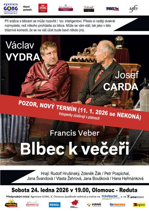 věříme, že do nového roku jste vkročili směle, pravou a také ve správném kulturním rozpoložení. I my průběžne plánujeme nové akce na rok 2026. Hned na počátek roku 2026 jsme naplánovali reprízu legendární komedie Blbec k večeři s V. Vydrou a J. Cardou (pozor, původní termín se z důvodu úrazu J. Cardu ruší a představení se tak uskuteční v sobotu 24. 1. 2026), dále se můžete těšit na komedie Nejstarší řemeslo, Polib tetičku a představení Cena za něžnost v hl. rolích se Simonou Stašovou a M. Etzlerem.